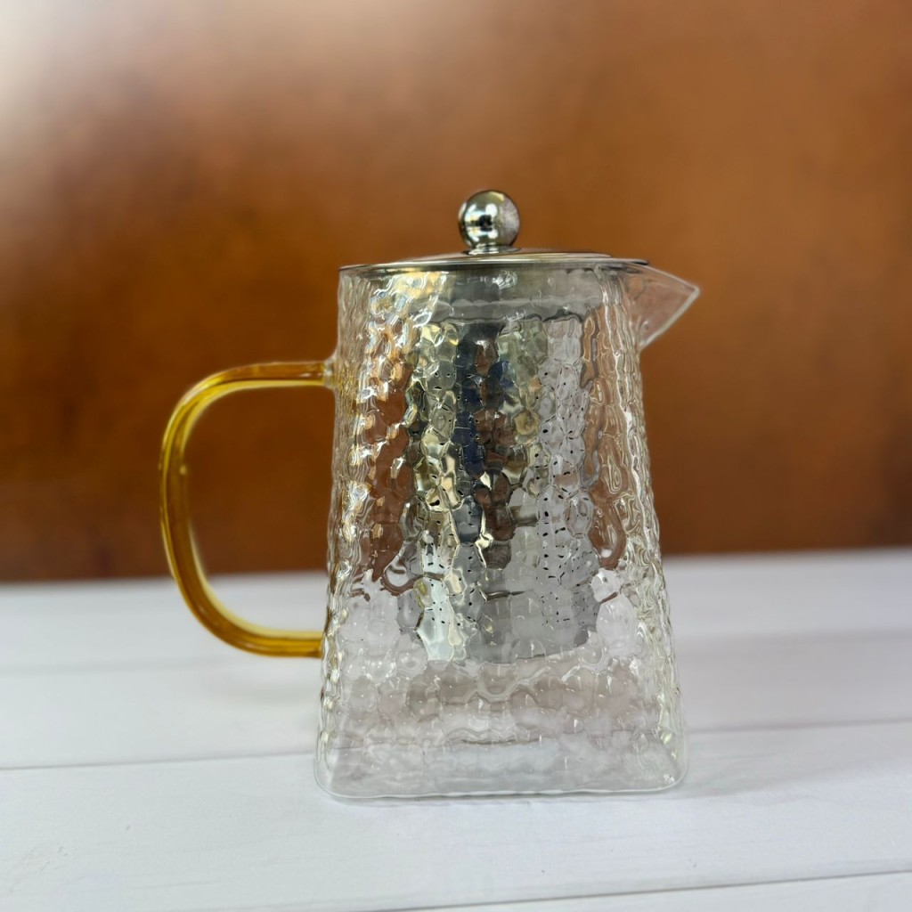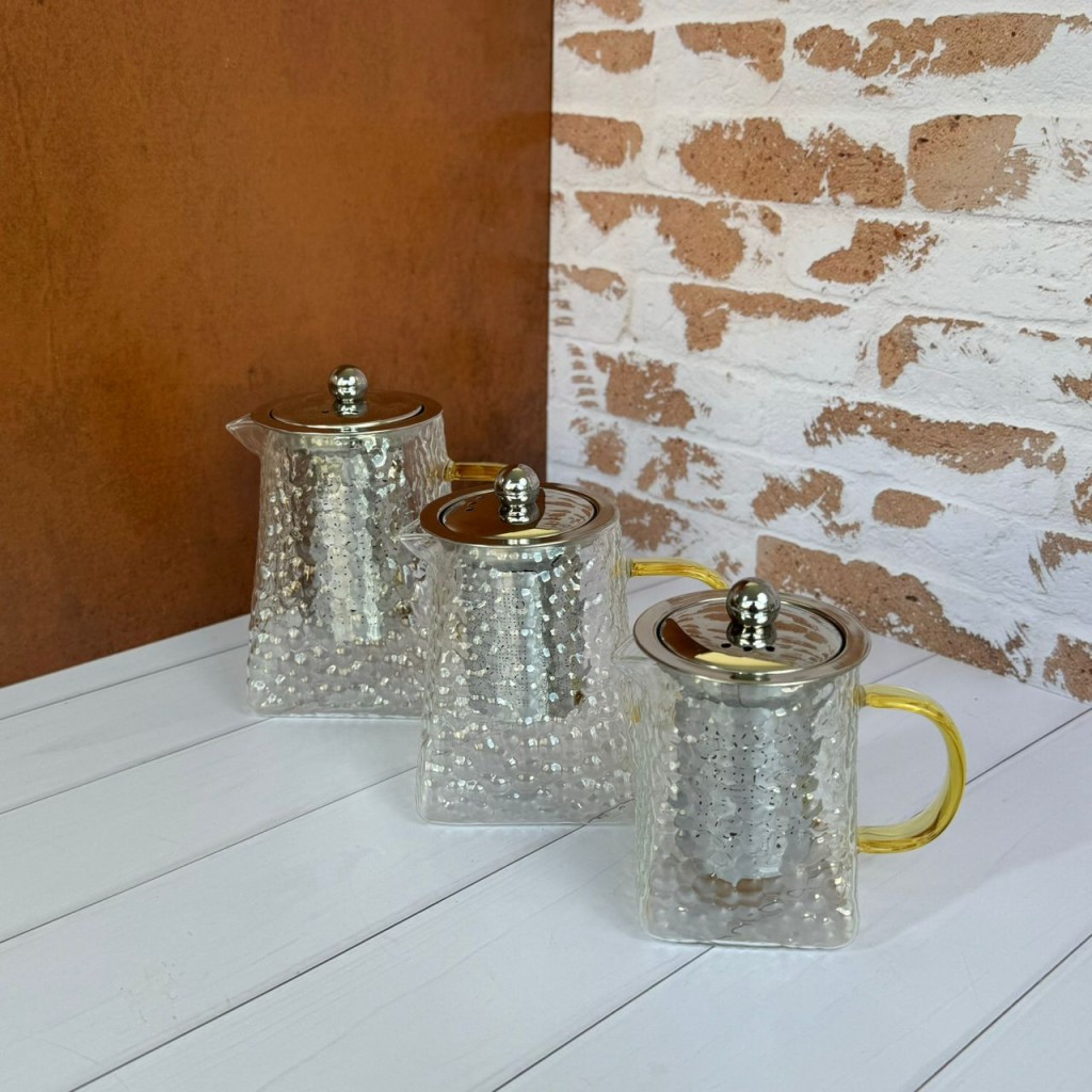 قوری پیرکس کف مربعی دسته طلایی صافی دار طرح سنگی