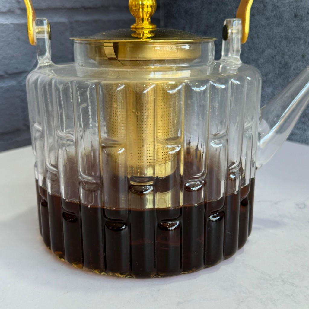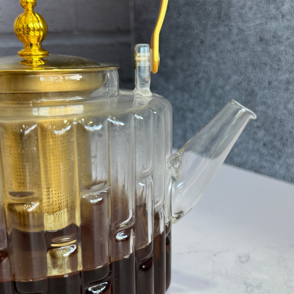 قوری پیرکس صافی دار دسته و درب طلایی همراه با نگهدارنده چوبی
