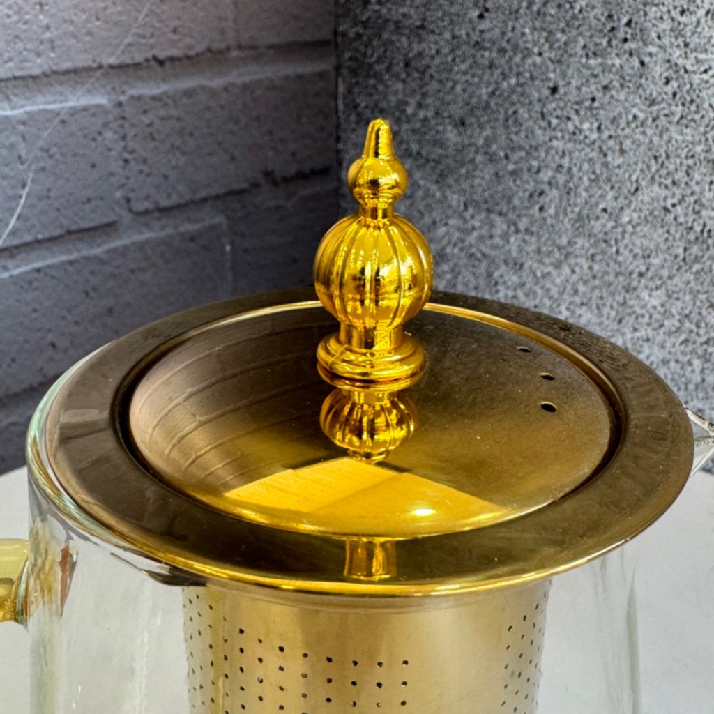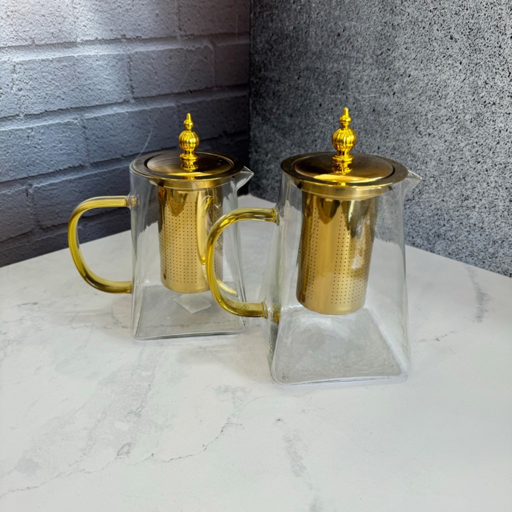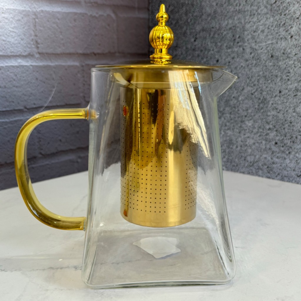 قوری پیرکس طلایی درب استیل صافی دار کف مربعی