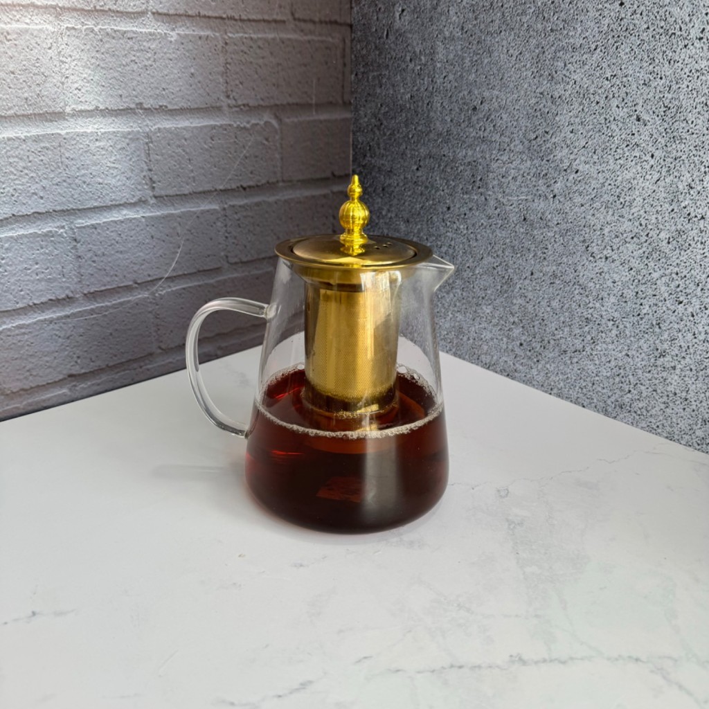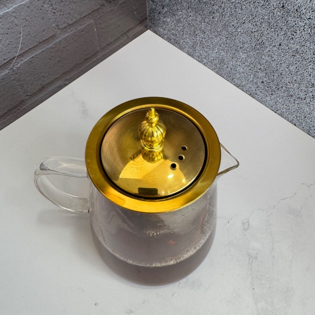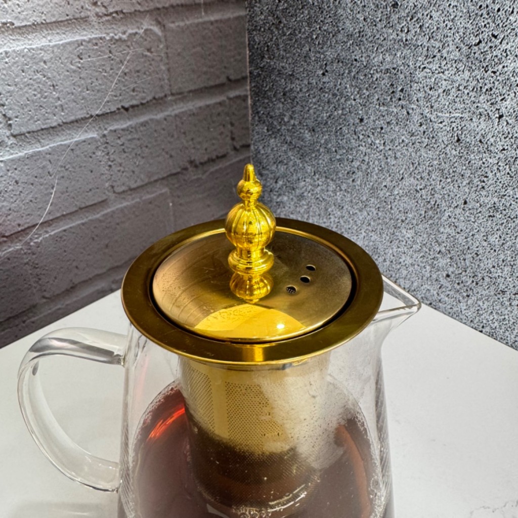 قوری پیرکس طلایی درب استیل صافی دار کف گرد