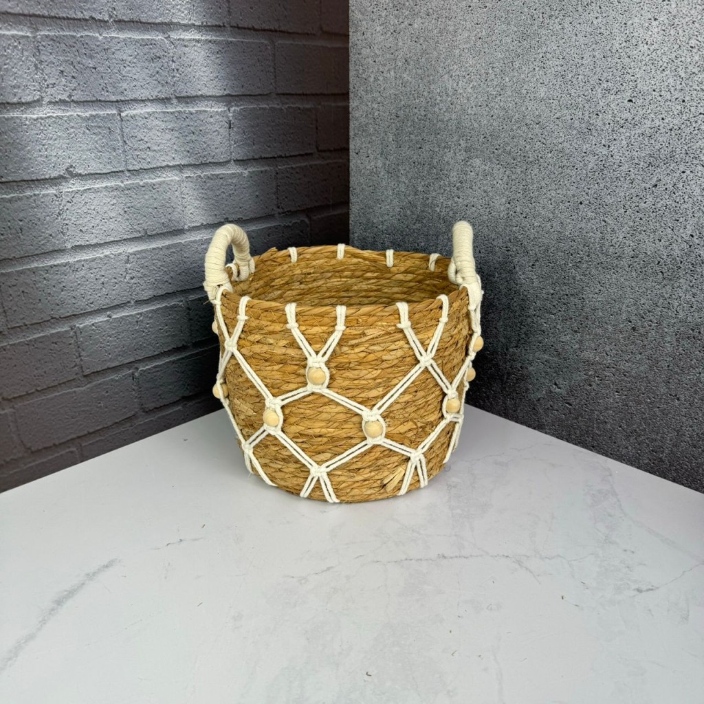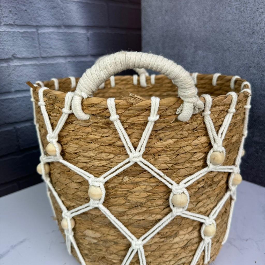 سبد حصیری سه عددی طرح آویز و دسته مکرومه