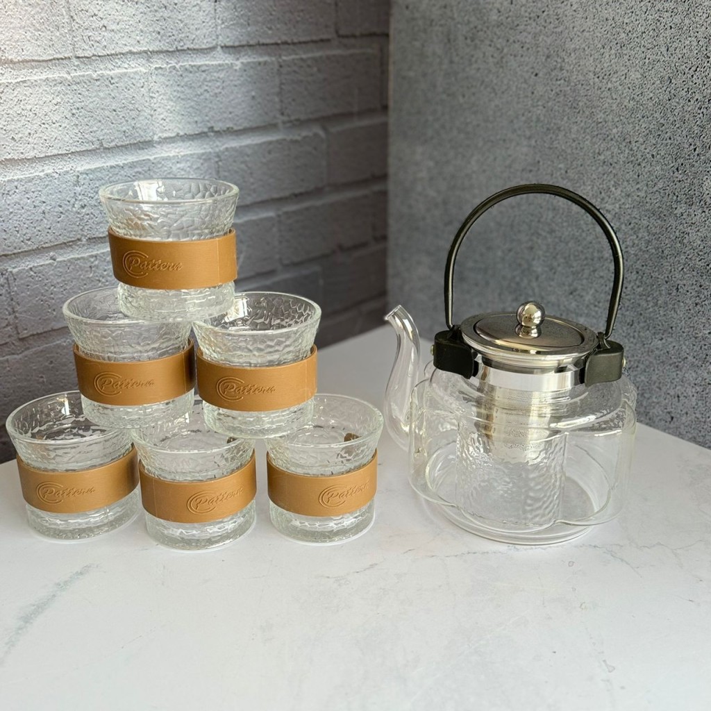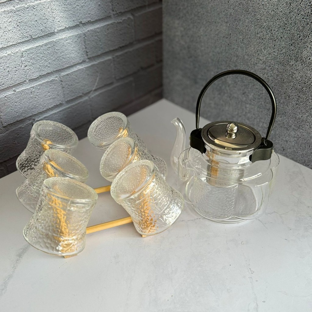 ست قوری و استکان پیرکس همراه با استند بامبو