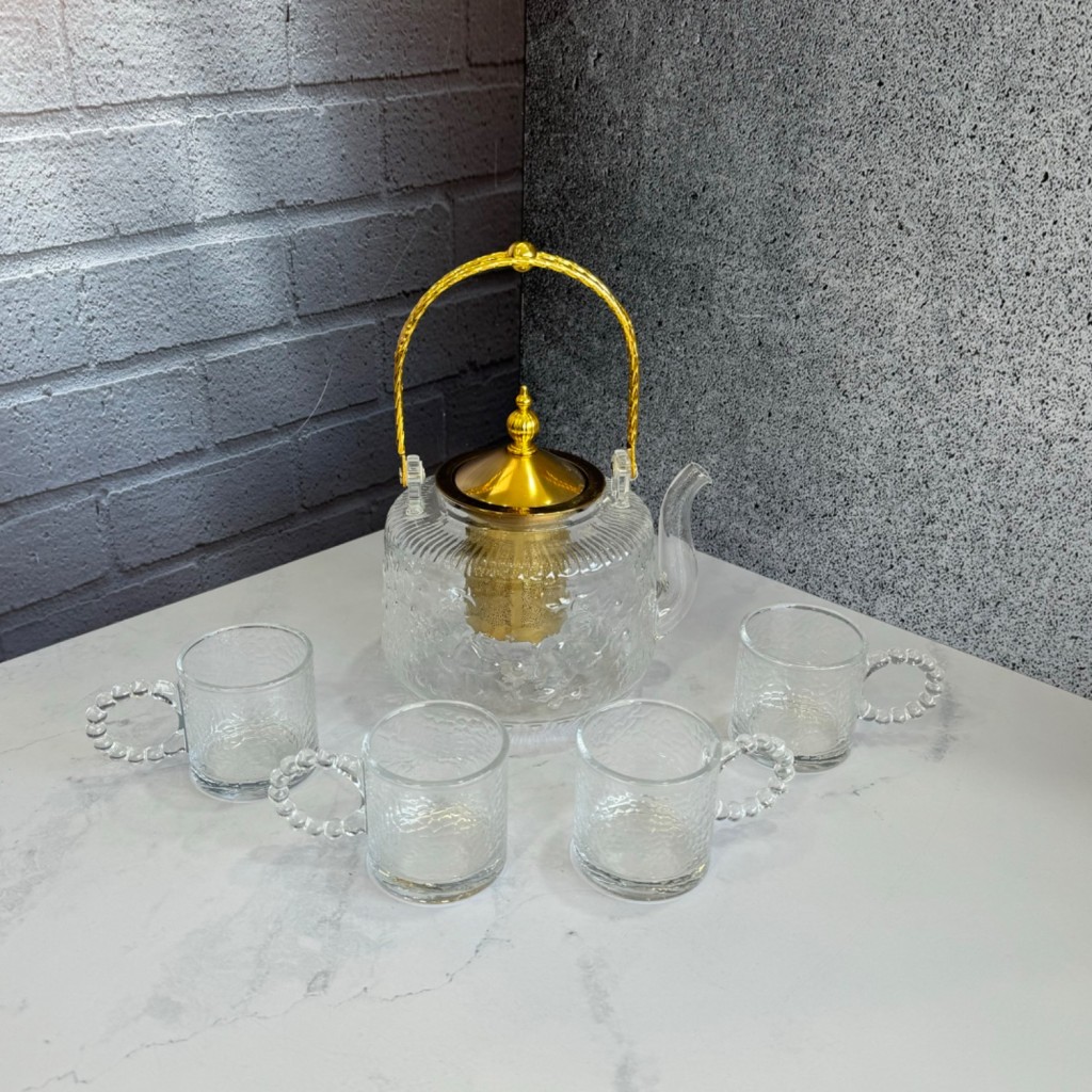 ست قوری و استکان پیرکس شعله مستقیم دسته طلایی