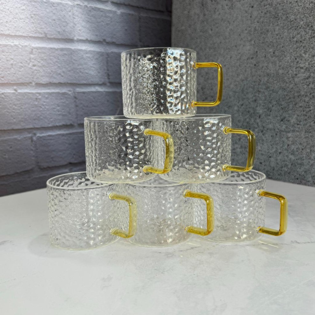 شات قهوه خوری پیرکس مدل سنگی ریز دسته طلایی 150میل